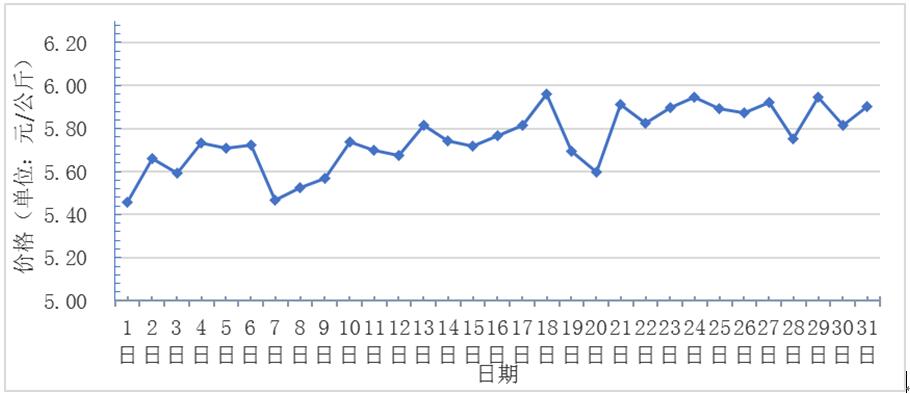 12月,全國重點監(jiān)測農(nóng)產(chǎn)品批發(fā)市場香蕉總交易量達9.5萬噸,同比上漲10.5%,環(huán)比上漲5.6%;總交易價值 56723.6萬元,同比上漲50.8%,環(huán)比上漲16.7%。日平均價格最高為6元/千克,最低為5.5元/千克,全月平均價格為5.8元/千克,同比上漲23.4%,環(huán)比上漲9.4%(每日價格變化如圖)。