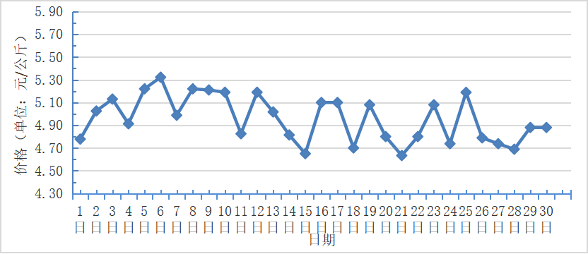 9月,全國(guó)重點(diǎn)監(jiān)測(cè)農(nóng)產(chǎn)品批發(fā)市場(chǎng)香蕉總交易量達(dá)2.2萬(wàn)噸,同比上漲4.80%,環(huán)比下降4.3%;總交易價(jià)值12518.2萬(wàn)元,同比下降9.1%,環(huán)比上漲6.1%。日平均價(jià)格最高為5.3元/千克,最低為4.7元/千克,全月平均價(jià)格為 5.0元/千克,同比下降25.4%,環(huán)比基本持平(每日價(jià)格變化如圖)。