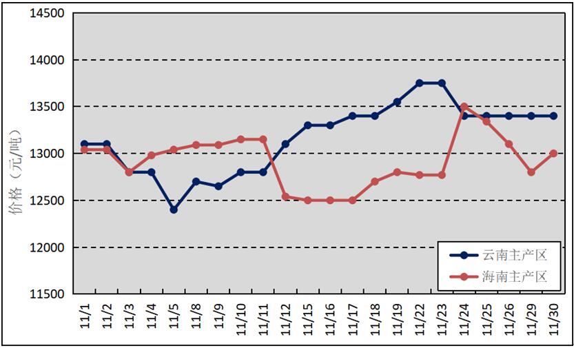 國內(nèi)主產(chǎn)區(qū):11月,我國天然橡膠主產(chǎn)區(qū)逐步向停割期過渡,受寒潮天氣影響,膠水產(chǎn)出有所減少,月底云南產(chǎn)區(qū)已大部分停割。海南原料膠(折干膠)月均價(jià)格為12918元/噸,環(huán)比下降295元/噸;云南原料膠(折干膠)月均價(jià)格為13168元/噸,環(huán)比上漲465元/噸。