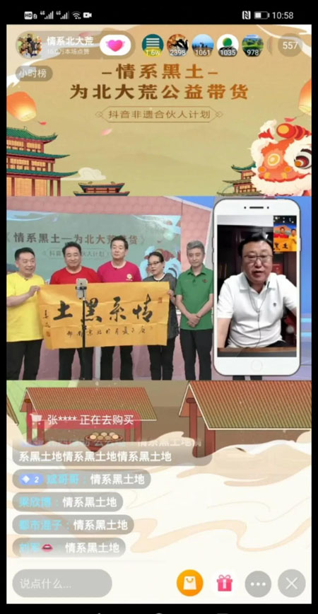 6月13日20點(diǎn),以“情系黑土——為北大荒帶貨”為主題的大型公益直播活動(dòng),在“情系北大荒”抖音賬號(hào)直播間、惠買(mǎi)網(wǎng)平臺(tái)同步直播。姜昆、濮存昕、李靜民、吳歡、周煒、戴志誠(chéng)6位著名藝術(shù)家化身“北大荒好物推薦官”,憶舊事、品美食,專(zhuān)場(chǎng)推介北大荒優(yōu)質(zhì)農(nóng)副產(chǎn)品。北大荒農(nóng)墾集團(tuán)有限公司(黑龍江省農(nóng)墾總局)黨委副書(shū)記、副董事長(zhǎng)、總經(jīng)理徐學(xué)陽(yáng),北大荒農(nóng)墾集團(tuán)有限公司(黑龍江省農(nóng)墾總局)黨委委員、副總經(jīng)理武安也作為“北大荒品牌推薦官”參與直播。